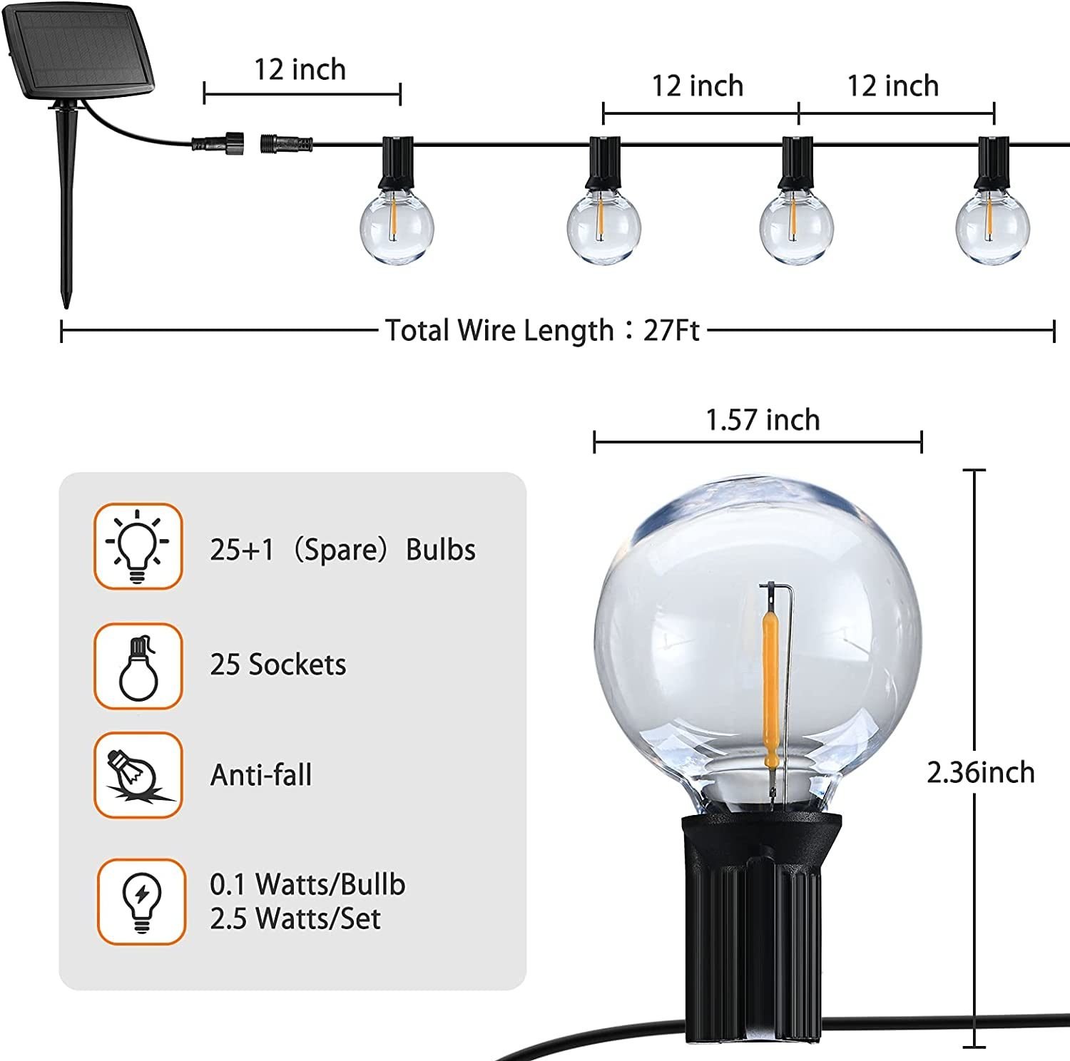 G40 Outdoor string lights come with 25 bulbs with 1 spare one; The outdoor solar string lights are designed with beautiful and brilliant lighting modes including quick flash; steady light; slow flash; pulsating light