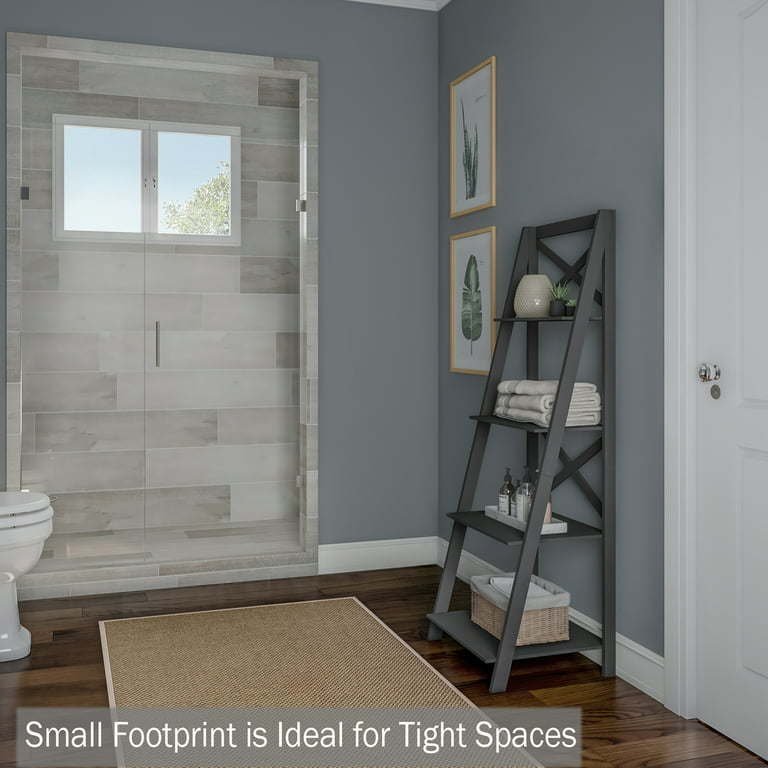 The 4-Shelf Ladder Bookshelf by Lavish Home is a perfect decorating and storage solution for your living room, bathroom, bedroom, office, or kitchen. This freestanding shelving unit is the perfect platform for displaying books, knick-knacks, photo frames, or other home decor. Constructed of gray painted manufactured wood, this stylish bookcase features a straight back with cross braces for added stability when placed against a wall and a descending angled design for a space-saving footprint in any room, big or small.