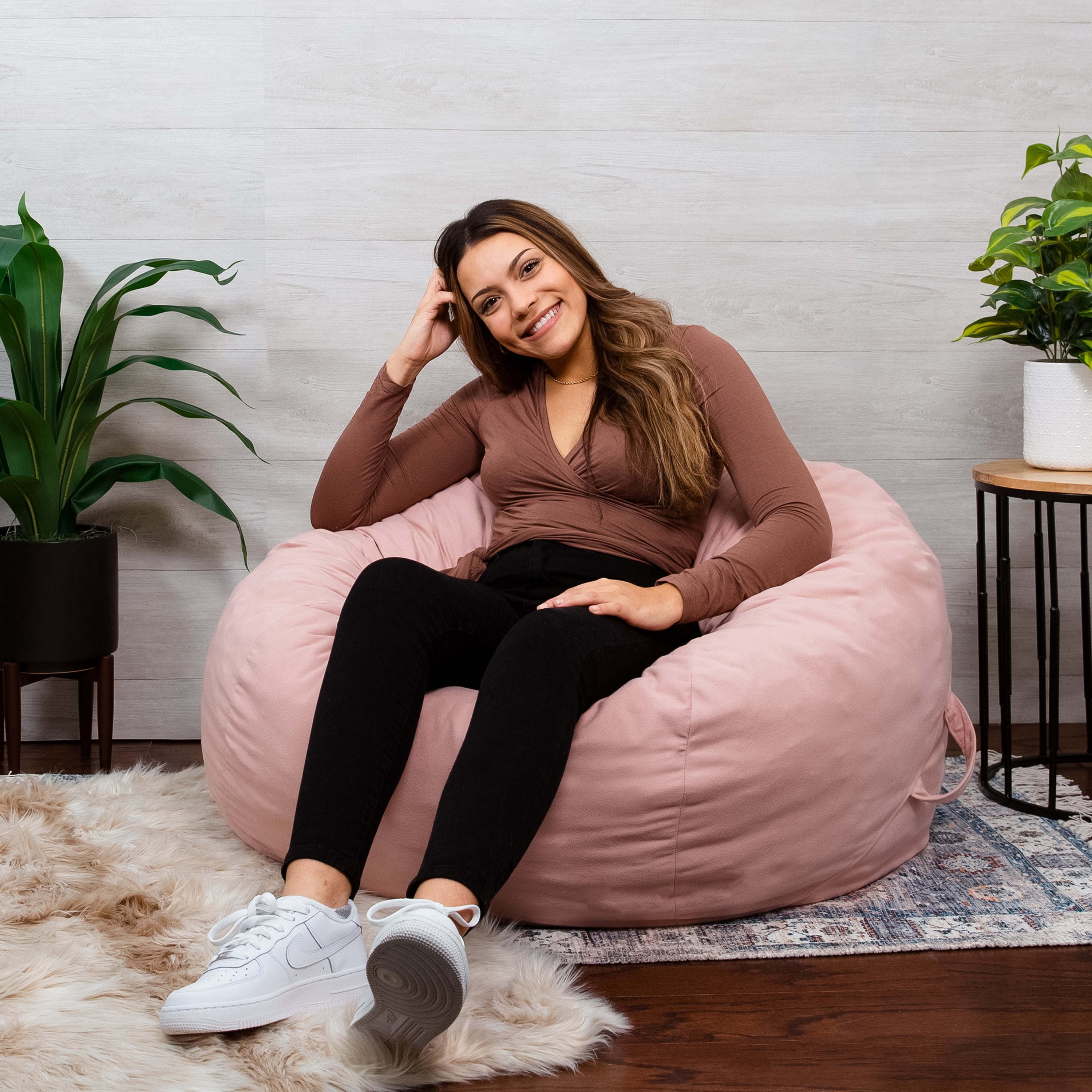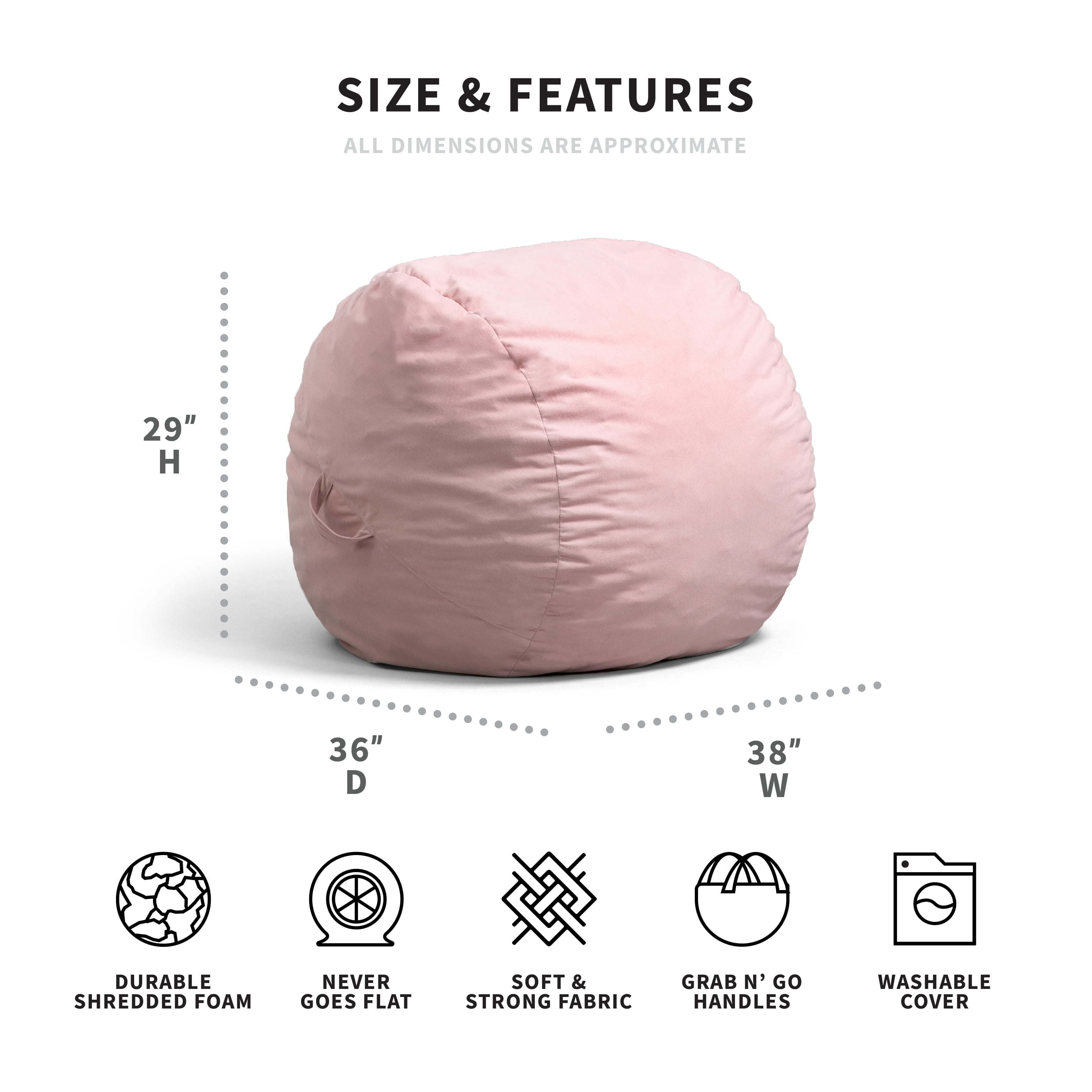 Big Joe Fuf Chair, Plush Desert RoseThe Big Joe Fuf Chair (pronounced fooo-f) is the closest you'll get to sitting on a cloud! Sink into your Fuf to nap, binge TV, read, or relax. Our patented shredded foam filling never goes flat which means you can refresh and enjoy your Fuf for years to come!This Fuf Chair measures 29W x 36D x 38H and weighs about 17 lb.Covered in our soft, snuggly Plush fabric with two built-in handles. Although this cover is not removable, spot cleaning is easily accomplished.Because your Fuf arrives compressed, it may take up to 48 hours to expand to its full Fuf potential. After that, it may occasionally need to be re-fufed by tossing it around to revive its filling.Our patented shredded foam filling never goes flat which means you can refresh and enjoy your Fuf for years to come! You can re-Fuf your chair by tossing it around to bring it back to life whenever it needs a pick-me-up.