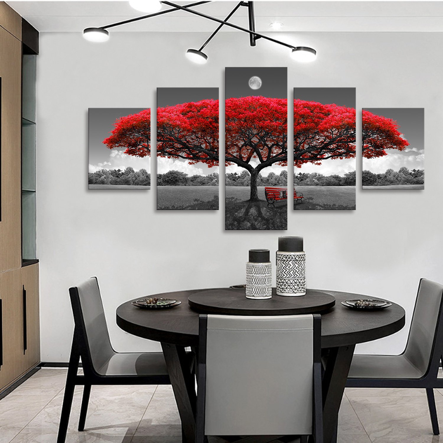 Home > Canvas Wall Art Red Tree Wall Art with Moon Black and White Landscape Pictures for Wall Decor Large Pictures for Living Room 5 Pieces