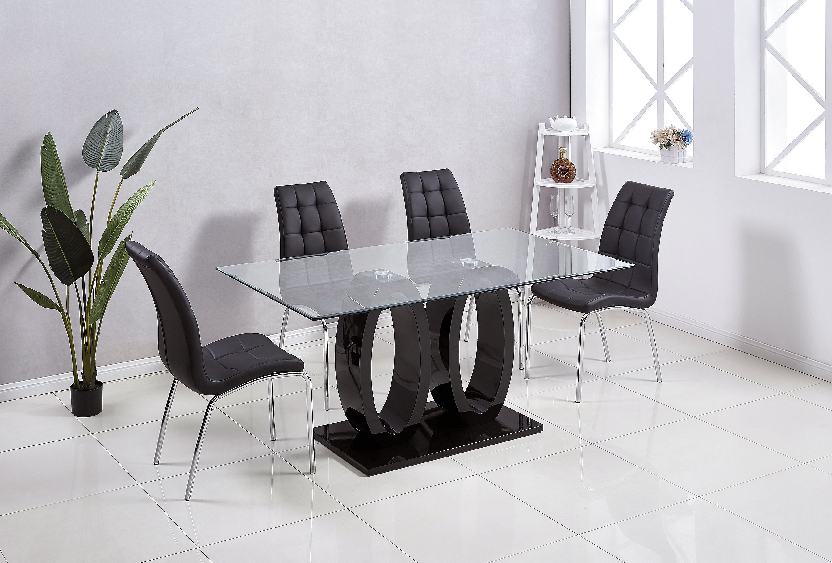 An ultramodern black dining table with a high gloss lacquer finish in a striking dual O-shaped base will be the centerpiece of your contemporary dining room. The rectangular tabletop is made from 0.39 inches thick tempered glass; and the double pedestal rests on a glossy rectangle base for a balanced; modern profile. The stunning; sculptural look of the table brings a sophisticated attitude into your home.