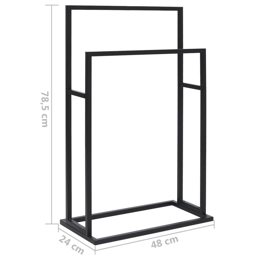 The freestanding towel holder is made of sturdy iron which makes it stable and durable. The rack; featuring 2 tiers; provides ample space for hanging towels to help keep your bathroom clutter free. Additionally; it can also be used for drying towels; washcloths or rags.Color: BlackMaterial: IronDimensions: 18.9" x 9.4" x 30.9" (W x D x H)Assembly required: Yes