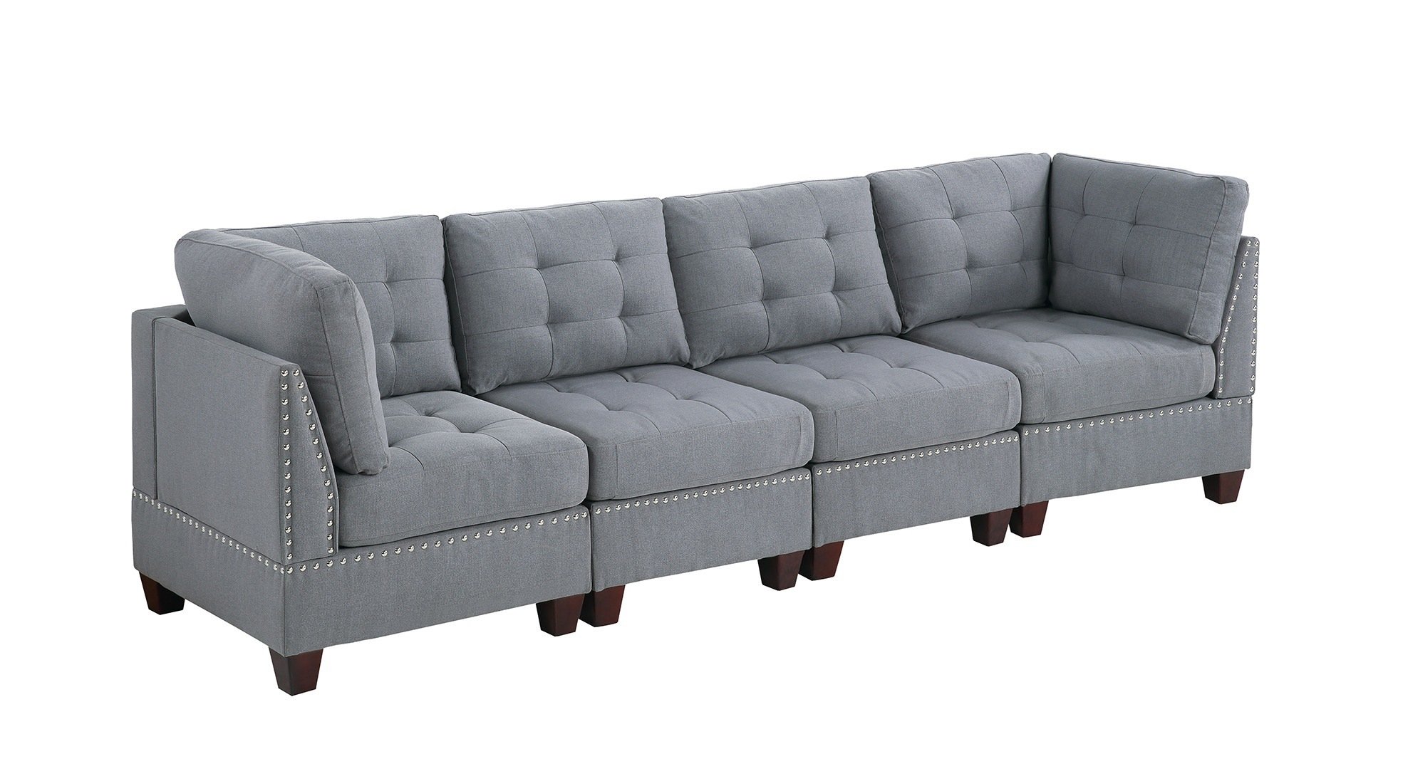 Description Product Description:- Combining simple form factor with special care paid attention to the finishing trim, this adjustable set brings elegance with a flair of classic decadence. With Armless Chair, (Optional Corner and ottoman) you can create a set that fit your exact need. Let this piece that comes in rustic dark bring the most optimal comfort to you and your guests, while displaying your taste for the classics. It will bring attention into your living living room. Product Features:- •Contemporary Style •Gray Color •Linen Like Fabric •Wood •Tufted Cushion •Nailheads •Plush Couch •wood Leg