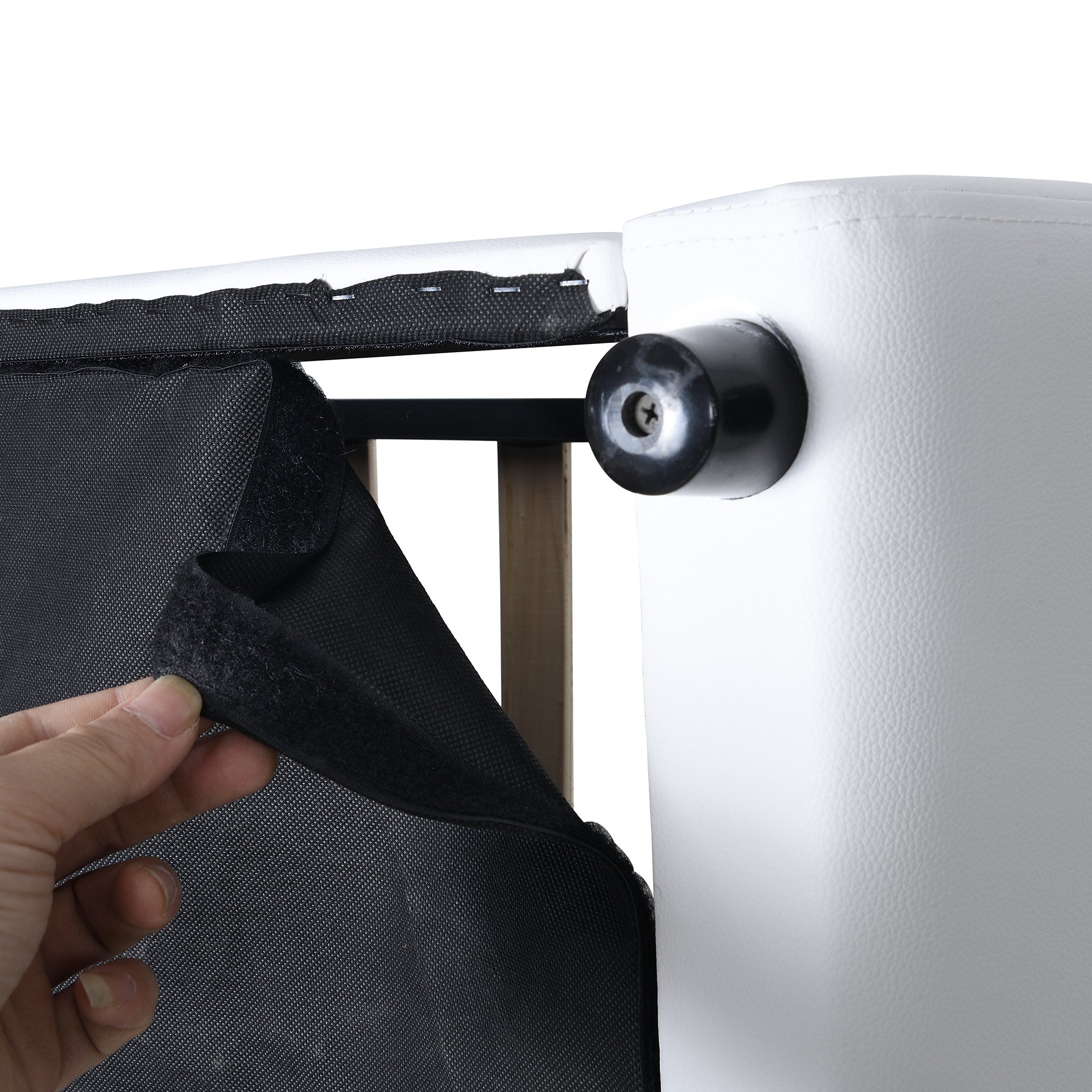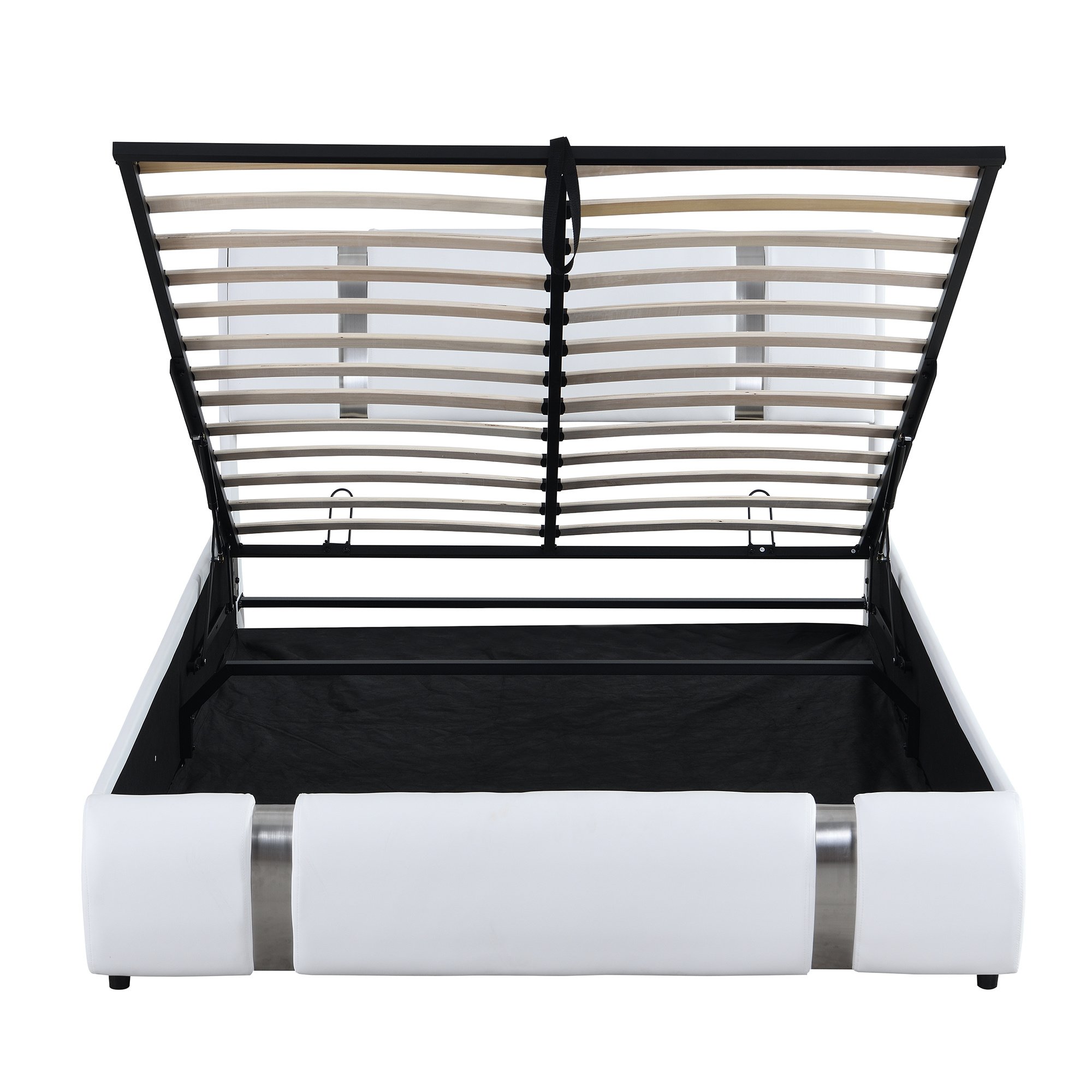 It's very simple to make your home unique, this faux leather upholstered bed witha hydraulic storage systemis worthy of your possession. Size is a good choice whether it is used in the master bedroom or guest room. This bed is available in 2 colors and 2 sizes, white and black/full and queen, allowing you to have a comfortable sleep. Metal strip is stylish that fits any room. Storage under thehydraulic system provides extra space for odds and ends.