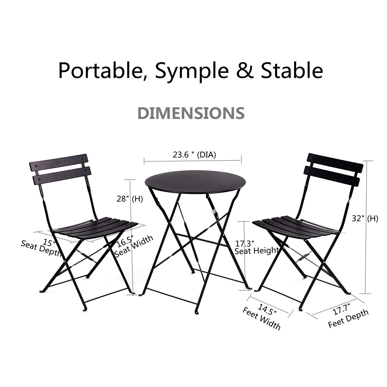 5.Size of Table: 23.6"(DIA) X 28"(H). Chair: 17.7"(D) X 14.5"(W) X 32"(H).