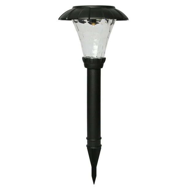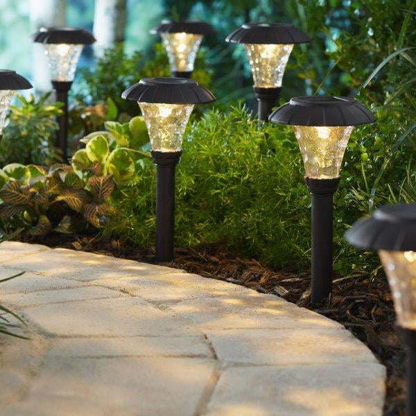 Mainstays Solar Stanford Pathway Light Set - 8 Pack: Outdoor solar path light High output LED - up to 10 lumens Outdoor Solar Landscape Lights for Lawn, Patio, Yard, Walkway, Driveway Plastic construction Amorphous panel 1 x omni-directional warm white LED Battery: 1 x 600mah 1. 2v AA ni-cd (included) Shadow plastic lens Black finish 8-piece set Beautiful shadow casting design Eco-friendly landscape lighting Stakes and rechargeable batteries included For optimal performance- Place in direct sunlight (or as close as possible) for 8 hours per day for all-night illumination.
