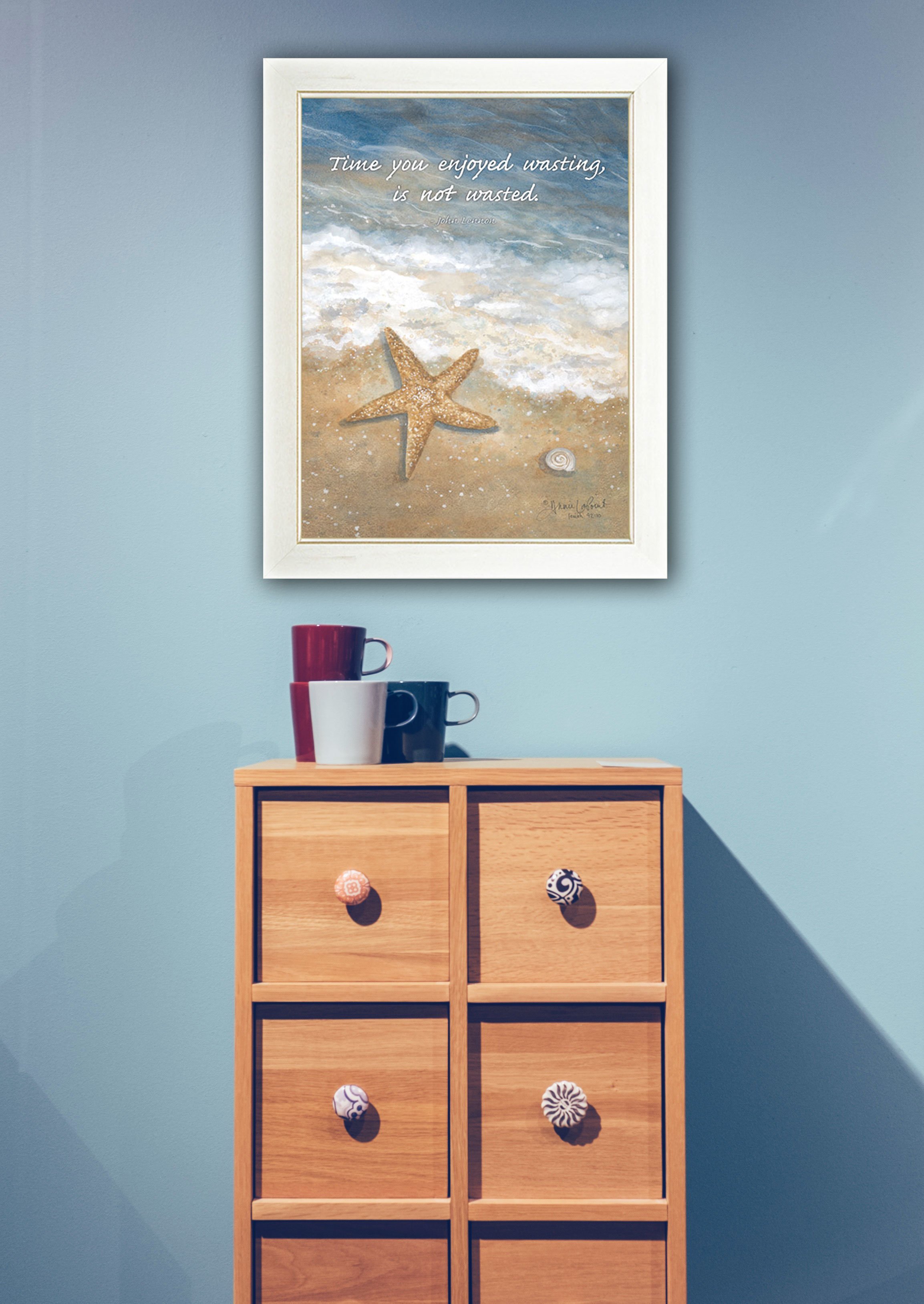 "Time Wasted" is a 10"x 14" framed print by artist Annie LaPointe. This artwork features a water scene with a starfish and the words time you enjoyed wasting is not wasted. This totally American Made wall decor item features an attractive frame; a textured canvas like finish so no glass is necessary and is ready to hang. •Women Owned (WBE)•Textured Artwork with a 'rolled on' acid free acrylic coating to create a canvas painting effect. No glass is necessary.•UV protectant coating protects artwork from fading.•MDF moulding adds natural beauty to the framed art. Frame is keyholed for ease of hanging.