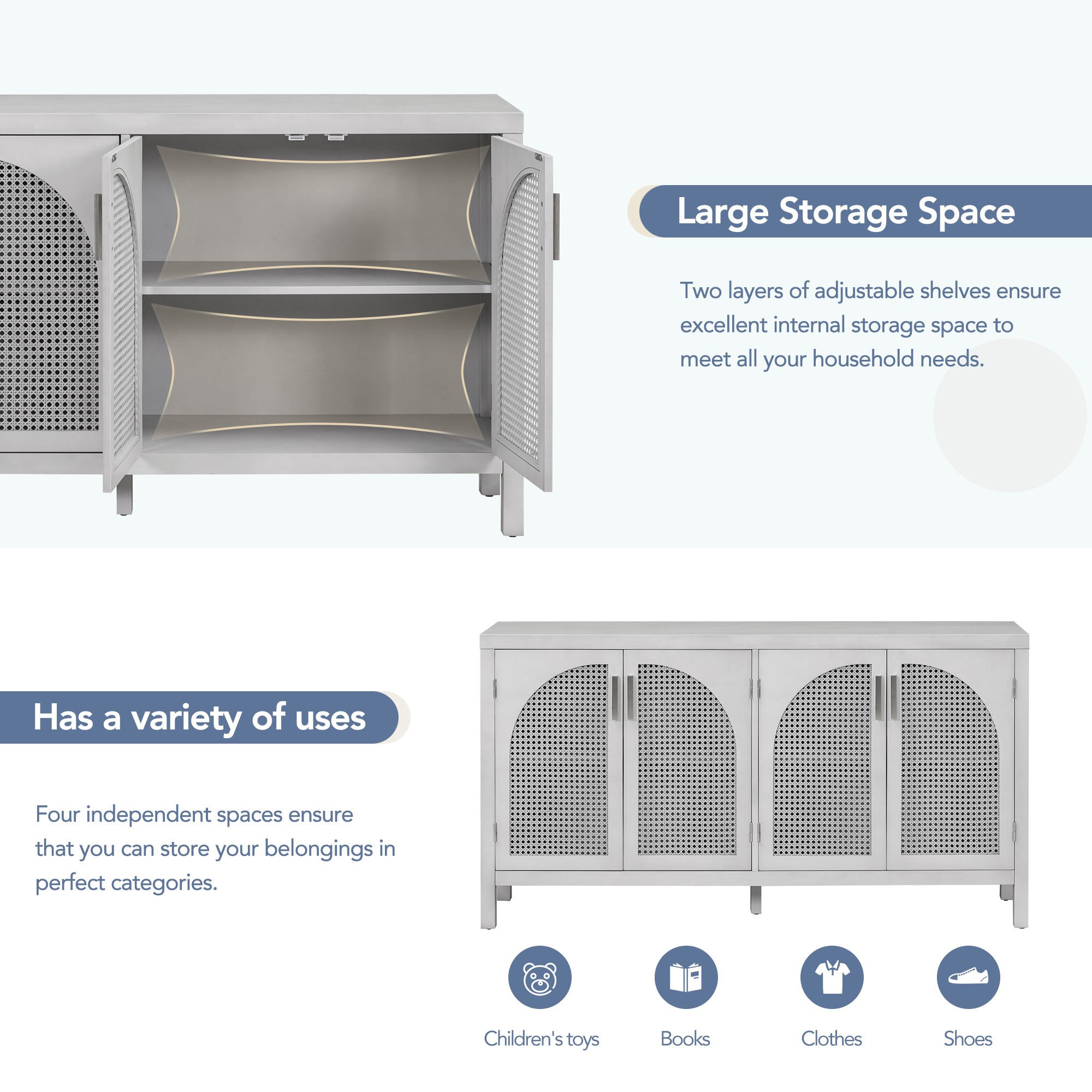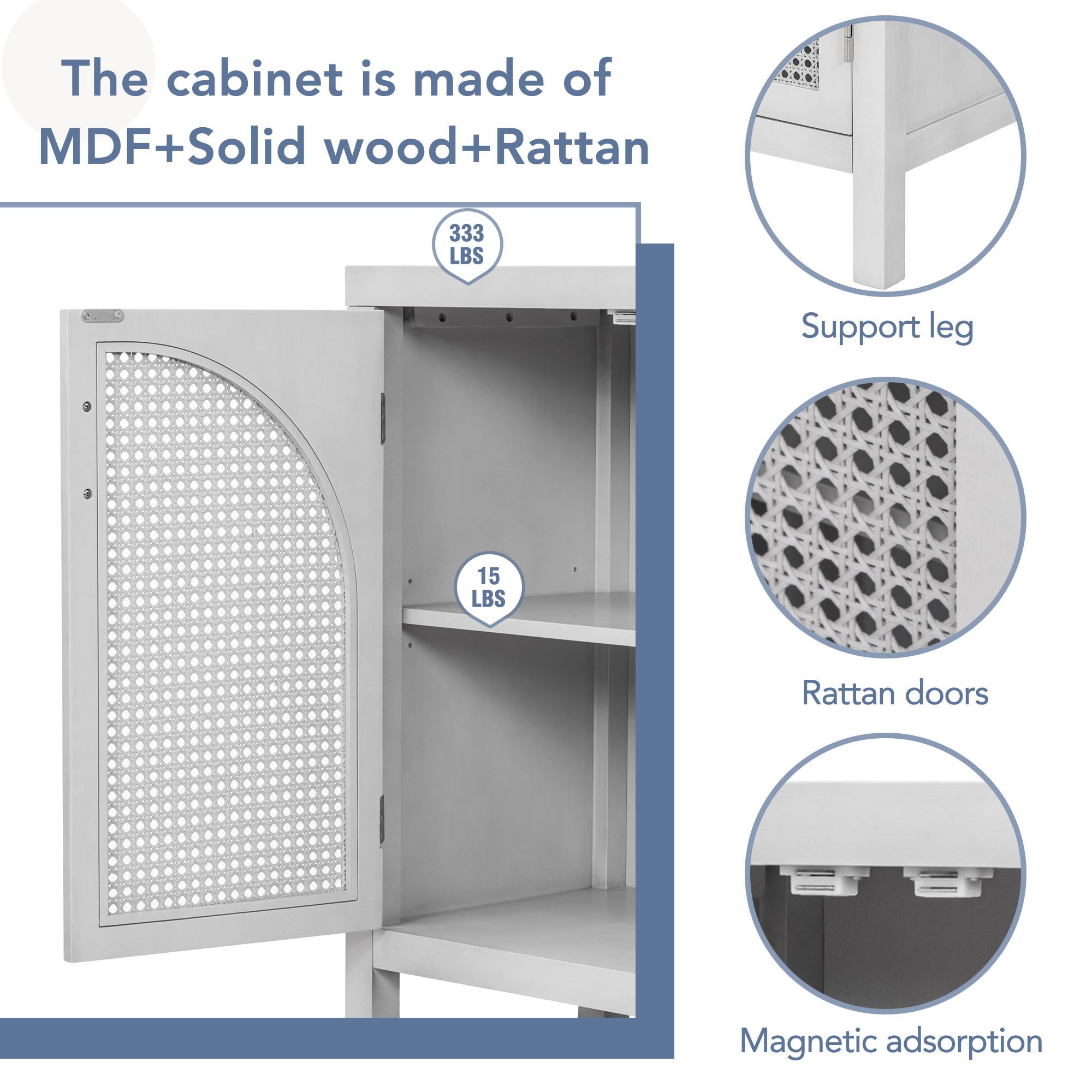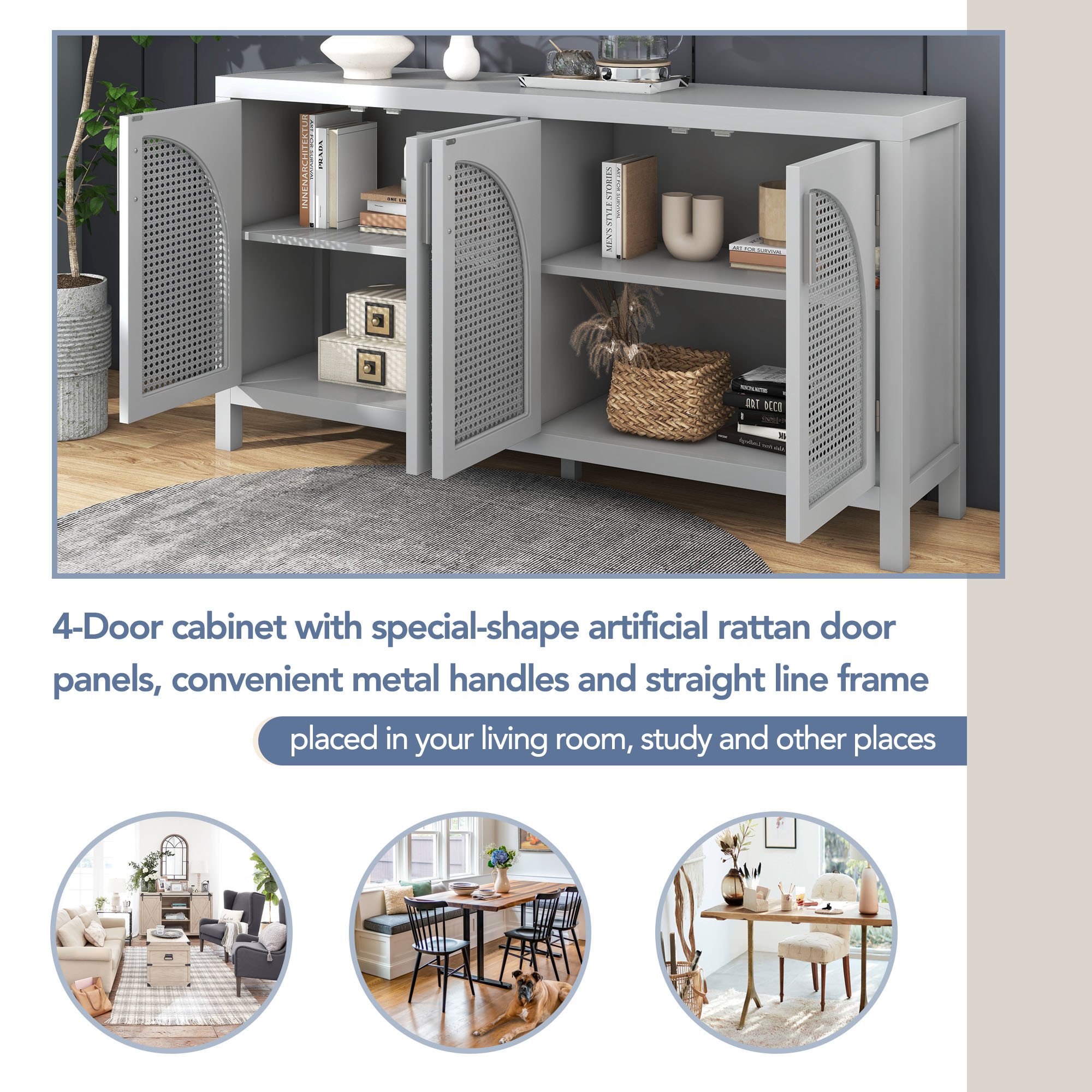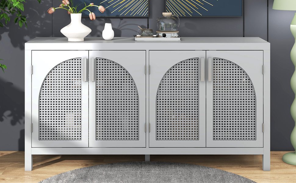 Features:1. Simple Style4-door cabinet with special-shape artificial rattan door panels, convenient metal handles and straight line frame can be placed in your living room, study and other places, making it an ideal choice for any room in your home. There are 3 colors for you to choose from. The details of the whole cabinet show the simplicity and generosity of the cabinet everywhere, and the classic cabinet is easy to match with your home style and won't be abrupt.2. Large Storage SpaceThis cabinet is versatile and can be used in a variety of home environments. Two layers of adjustable shelves ensure excellent internal storage space to meet all your household needs. Four independent spaces ensure that you can store your belongings in perfect categories. And has a variety of uses, not limited to preventing children's toys, books, clothes, shoes, etc., to meet your storage needs.3. High-quality MaterialsThe cabinet is made of MDF+Solid wood+Rattan, and high-quality wood ensures the durability and safety of the cabinet. Four solid wood table legs and one solid wood support leg in the middle ensure the stability and durability of the cabinet. The table top can bear 333 pounds, and the adjustable laminate can bear 15 pounds, which ensures the safety and stability while providing sufficient storage space.4. Excellent WorkmanshipFour curved-shape artificial rattan doors make the whole cabinet look more unique and fashionable. The hollowed-out door not only ensures the aesthetics and air permeability, but also ensures the closedness of the cabinet, preventing articles from falling out. The door handle of the cabinet is made of metal, which increases the wear resistance. The door is equipped with magnetic adsorption, which is beneficial for opening and closing. 5. Assembly & DimensionsFull assembly required. The cabinet comes with detailed instructions, and it can be installed step by step following the instructions, which can help you complete the assembly as soon as possible. Overall dimensions: 58.1" x 14.1" x 30.6'.
