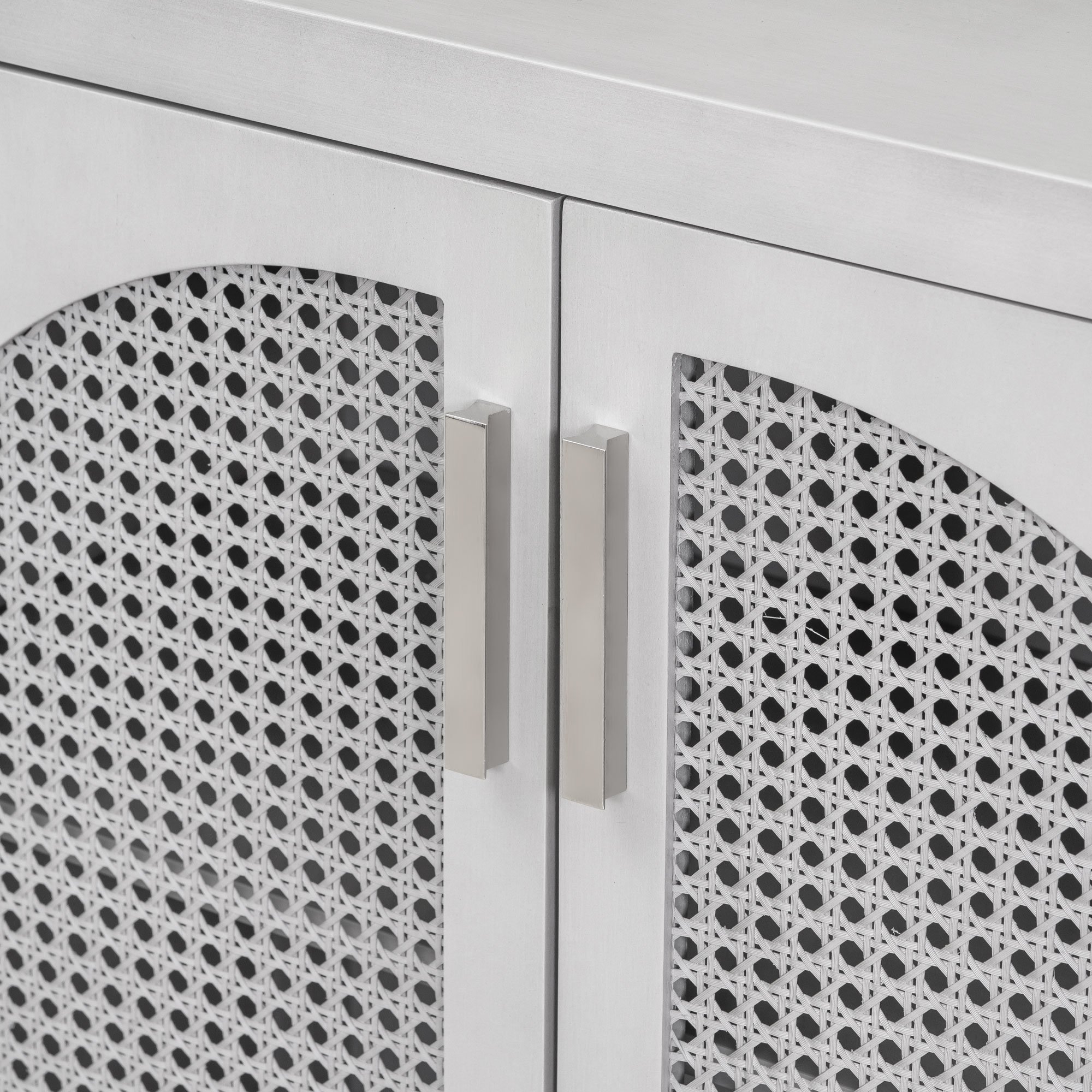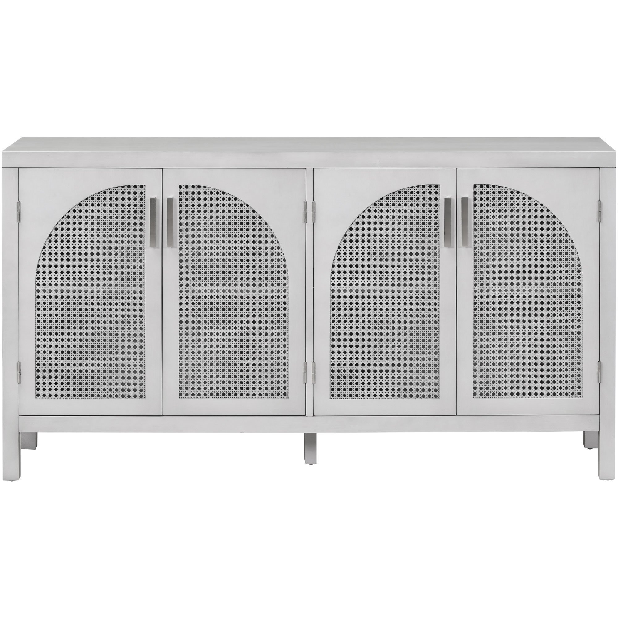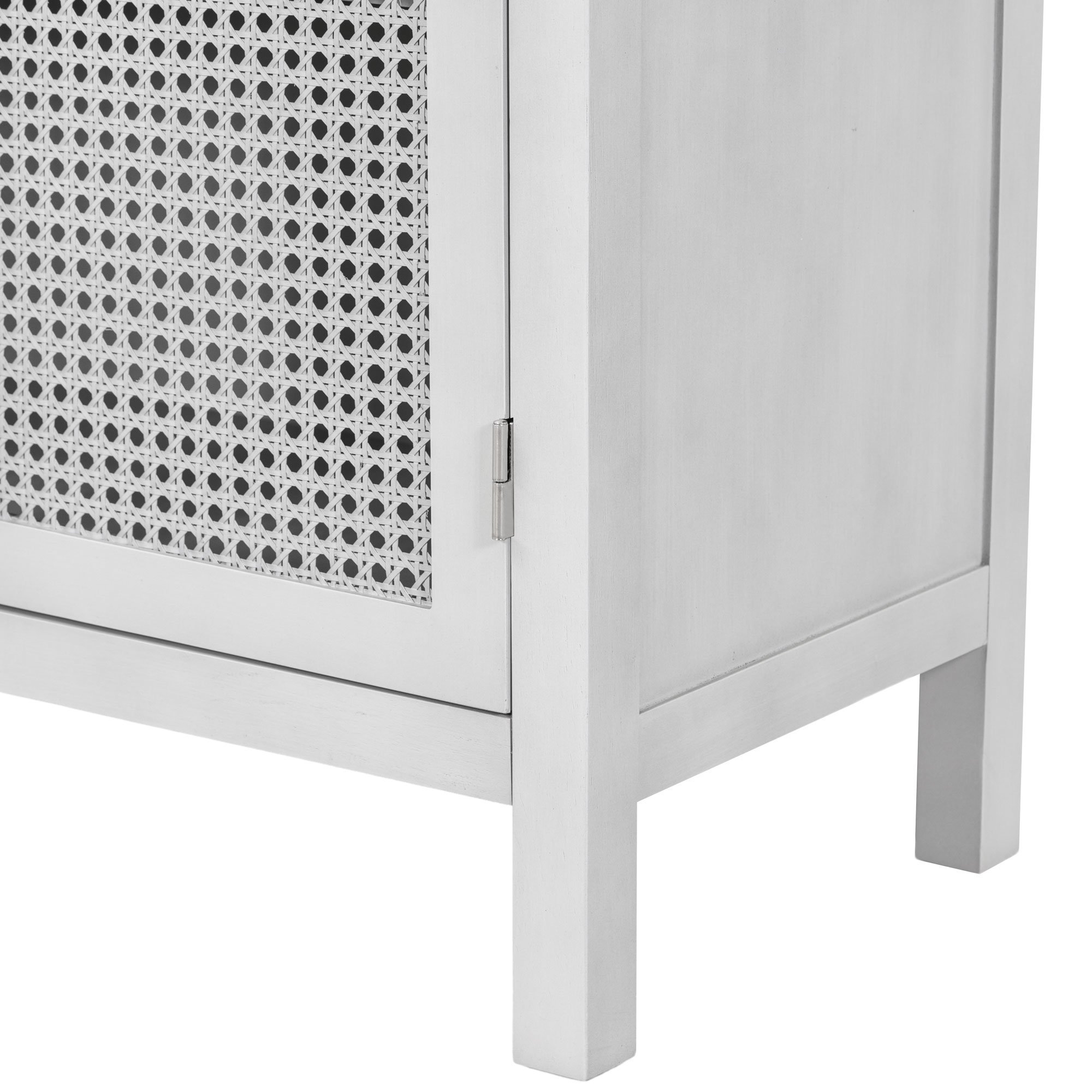 Features:1. Simple Style4-door cabinet with special-shape artificial rattan door panels, convenient metal handles and straight line frame can be placed in your living room, study and other places, making it an ideal choice for any room in your home. There are 3 colors for you to choose from. The details of the whole cabinet show the simplicity and generosity of the cabinet everywhere, and the classic cabinet is easy to match with your home style and won't be abrupt.2. Large Storage SpaceThis cabinet is versatile and can be used in a variety of home environments. Two layers of adjustable shelves ensure excellent internal storage space to meet all your household needs. Four independent spaces ensure that you can store your belongings in perfect categories. And has a variety of uses, not limited to preventing children's toys, books, clothes, shoes, etc., to meet your storage needs.3. High-quality MaterialsThe cabinet is made of MDF+Solid wood+Rattan, and high-quality wood ensures the durability and safety of the cabinet. Four solid wood table legs and one solid wood support leg in the middle ensure the stability and durability of the cabinet. The table top can bear 333 pounds, and the adjustable laminate can bear 15 pounds, which ensures the safety and stability while providing sufficient storage space.4. Excellent WorkmanshipFour curved-shape artificial rattan doors make the whole cabinet look more unique and fashionable. The hollowed-out door not only ensures the aesthetics and air permeability, but also ensures the closedness of the cabinet, preventing articles from falling out. The door handle of the cabinet is made of metal, which increases the wear resistance. The door is equipped with magnetic adsorption, which is beneficial for opening and closing. 5. Assembly & DimensionsFull assembly required. The cabinet comes with detailed instructions, and it can be installed step by step following the instructions, which can help you complete the assembly as soon as possible. Overall dimensions: 58.1" x 14.1" x 30.6'.