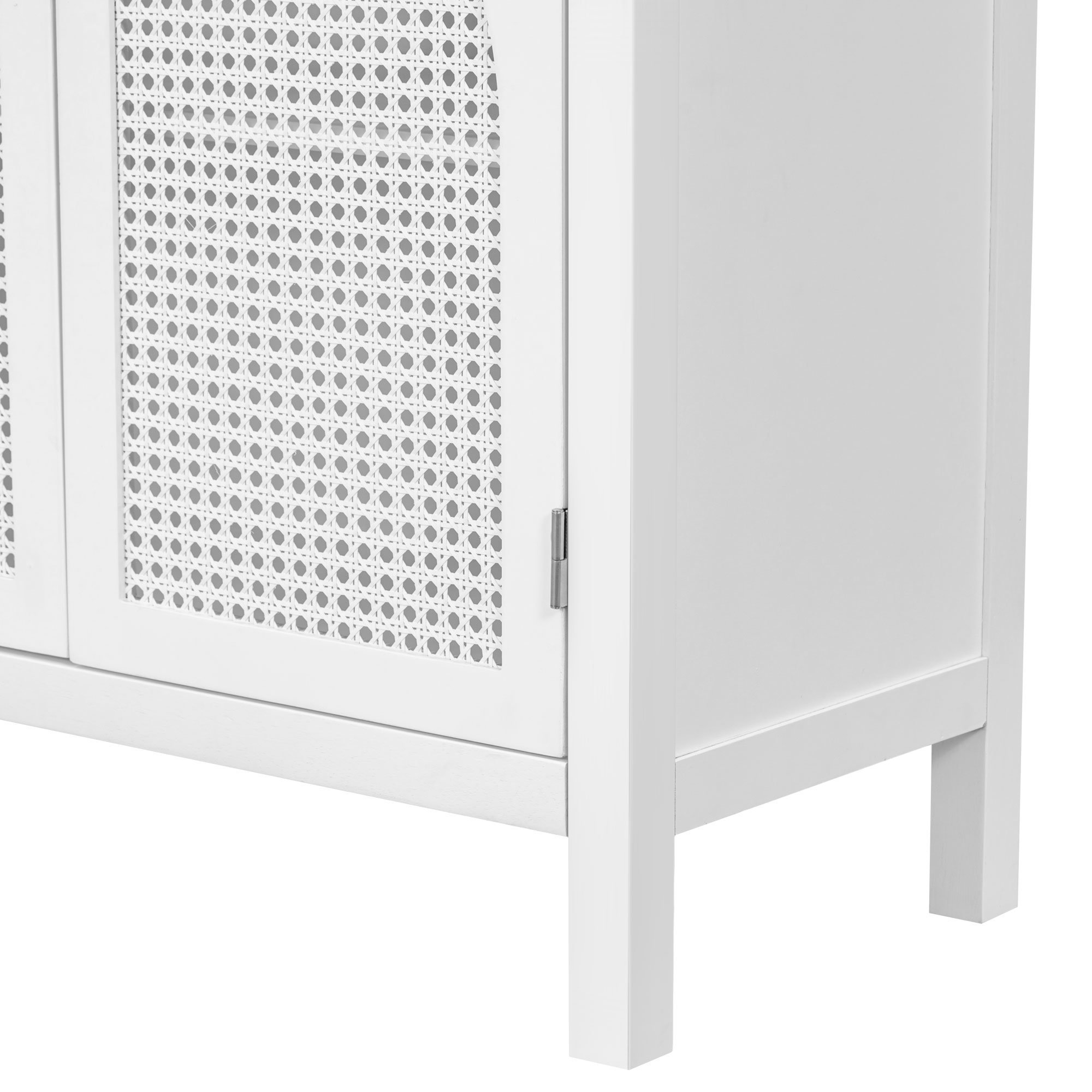 Features:1. Simple Style4-door cabinet with special-shape artificial rattan door panels, convenient metal handles and straight line frame can be placed in your living room, study and other places, making it an ideal choice for any room in your home. There are 3 colors for you to choose from. The details of the whole cabinet show the simplicity and generosity of the cabinet everywhere, and the classic cabinet is easy to match with your home style and won't be abrupt.2. Large Storage SpaceThis cabinet is versatile and can be used in a variety of home environments. Two layers of adjustable shelves ensure excellent internal storage space to meet all your household needs. Four independent spaces ensure that you can store your belongings in perfect categories. And has a variety of uses, not limited to preventing children's toys, books, clothes, shoes, etc., to meet your storage needs.3. High-quality MaterialsThe cabinet is made of MDF+Solid wood+Rattan, and high-quality wood ensures the durability and safety of the cabinet. Four solid wood table legs and one solid wood support leg in the middle ensure the stability and durability of the cabinet. The table top can bear 333 pounds, and the adjustable laminate can bear 15 pounds, which ensures the safety and stability while providing sufficient storage space.4. Excellent WorkmanshipFour curved-shape artificial rattan doors make the whole cabinet look more unique and fashionable. The hollowed-out door not only ensures the aesthetics and air permeability, but also ensures the closedness of the cabinet, preventing articles from falling out. The door handle of the cabinet is made of metal, which increases the wear resistance. The door is equipped with magnetic adsorption, which is beneficial for opening and closing. 5. Assembly & DimensionsFull assembly required. The cabinet comes with detailed instructions, and it can be installed step by step following the instructions, which can help you complete the assembly as soon as possible. Overall dimensions: 58.1" x 14.1" x 30.6'. Any damage during transportation will be compensated. If you have any questions about the goods, please feel free to contact our customer service.