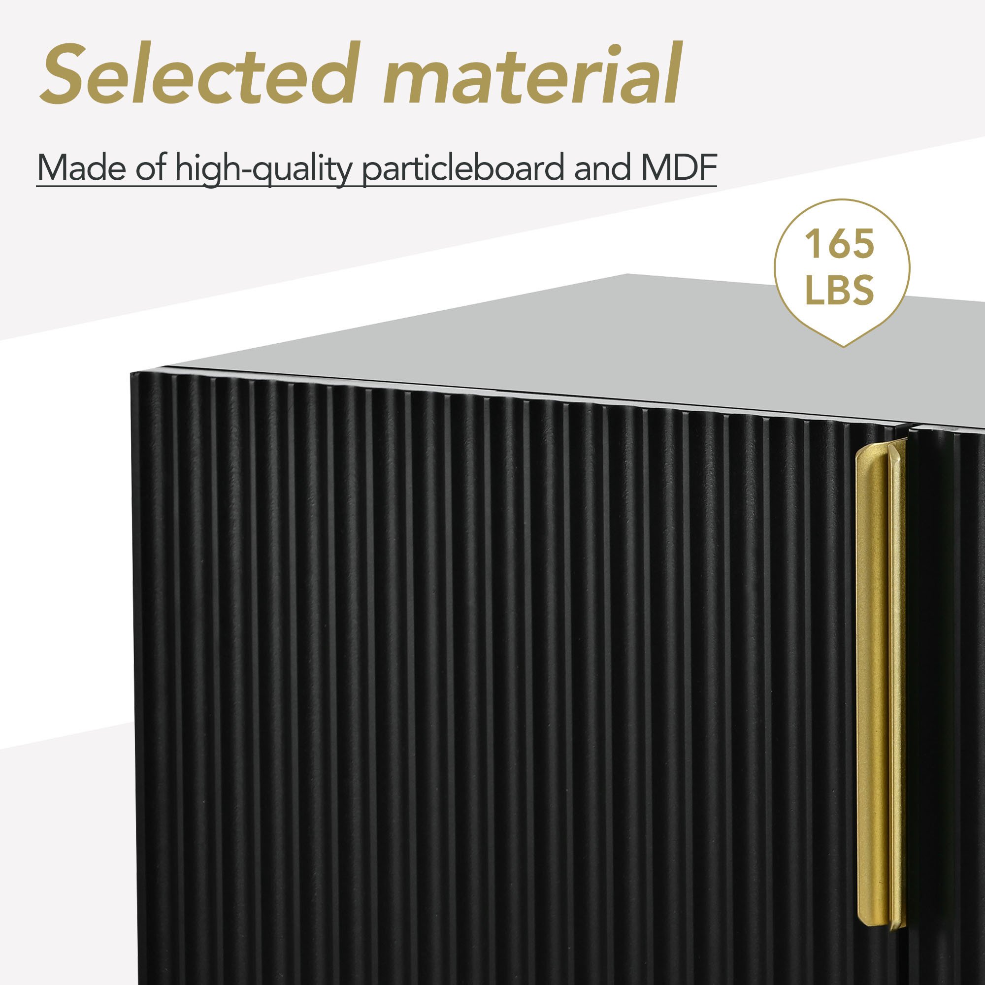 2. Selected materialThe sideboard body is made of particleboard, and the tabletop is made of high-quality MDF, which has good load-bearing capacity. Desktop load capacity: 165 lbs. The doors, tabletop and side panels have been painted for a smoother finish. Other panels' surfaces are covered with stickers. The sturdy metal legs ensure good support and stability.3. Large storageA sideboard with four doors will provide plenty of storage space for you. In addition, the internal shelves can be adjusted to three different heights, which you can adjust or remove according to your needs. Plates, bowls, wine glasses or small appliances of different sizes can be put on the sideboard. You can also put it in the bedroom to store clothes. Product Dimensions: 60"L x 15.2"W x 30.9"H.4. Exquisite workmanshipThe sideboard door is designed with wavy stripes, and the uneven geometric lines enhance the three-dimensional effect. Metal door handles and metal legs add texture and luxury to this buffet cabinet. The smooth finish makes the sideboard easier to clean, you just need to wipe the stain with a damp cloth, to extend the life of the sideboard.5. Installation & ServiceThe product comes with an installation manual with detailed installation steps. Follow the instructions step by step without error. You need to spend an hour, you can get a full sideboard. If you have any questions, please feel free to contact us, we will reply within 24h.