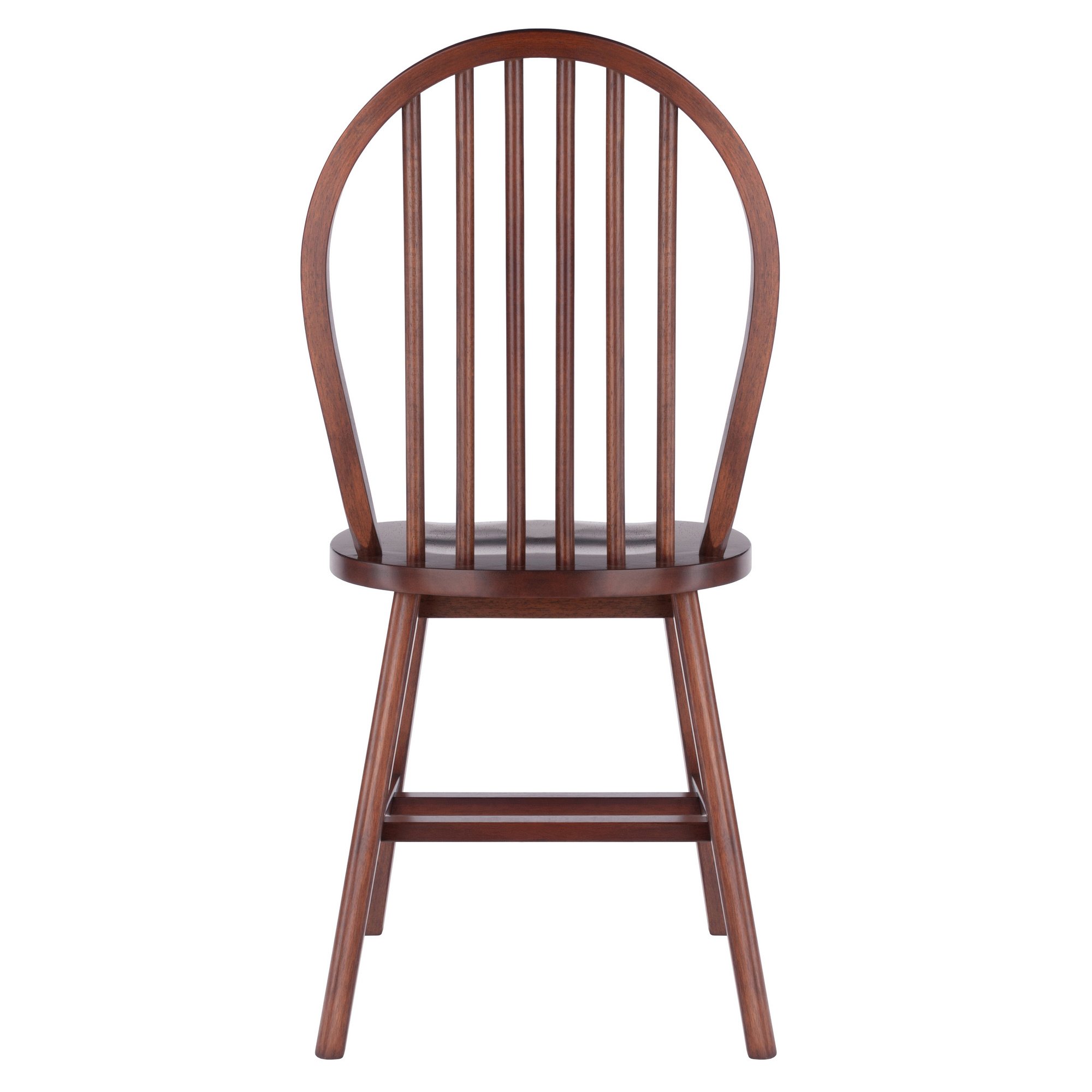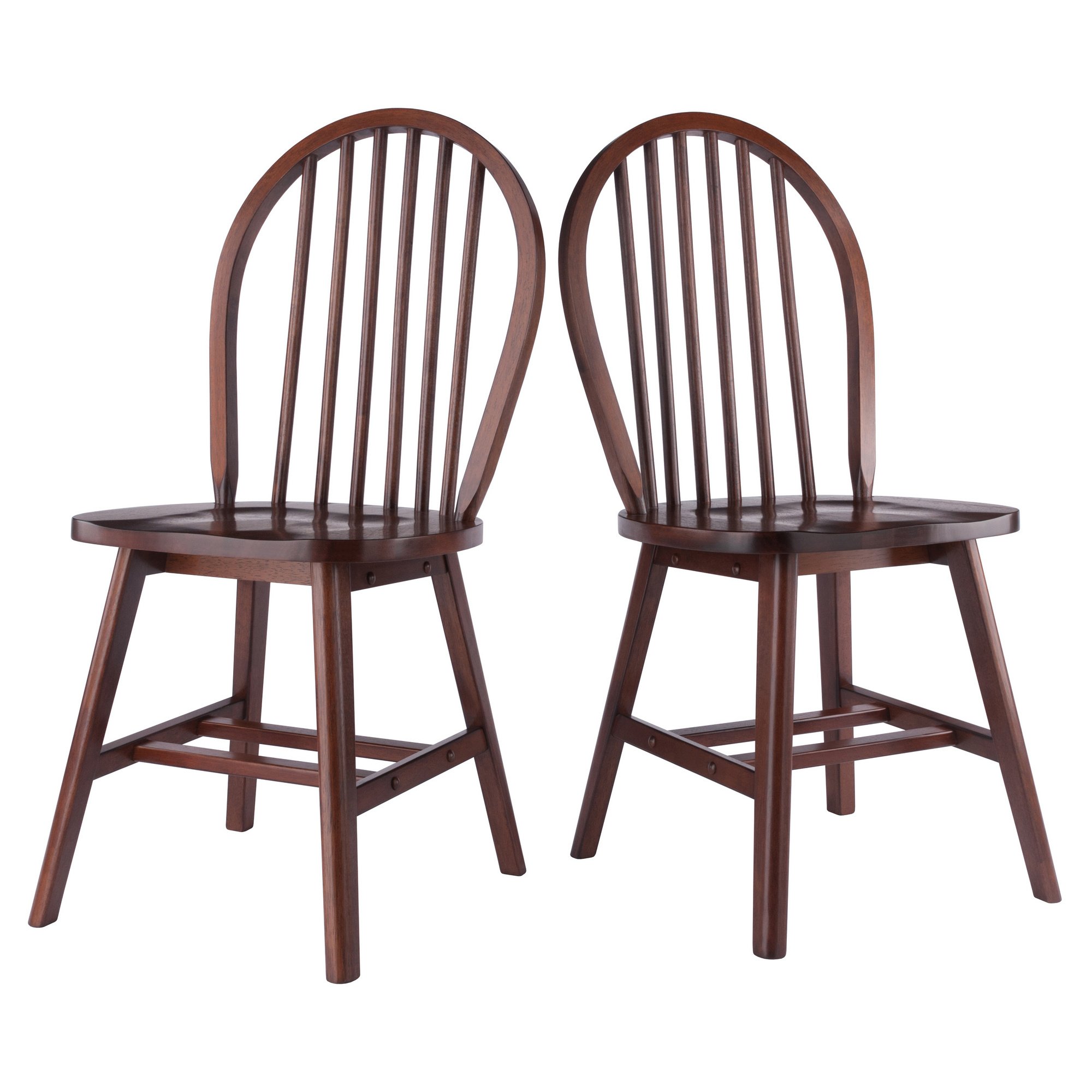 As early as the 16th century;  English woodworkers began fashioning chair spindles in the same way they made wheel spokes;  a design that became known as the Windsor Chair. This Winsome 2-piece set echoes that tradition. The 6-spindle arched back and the wide contoured seat offer the kind of support you want when lingering over dinner. The chairs are made of solid wood in a walnut finish that will lend warmth to your kitchen or dining area. A double set of crossbars add durability and stability. Static weight capacity is 220 lbs.